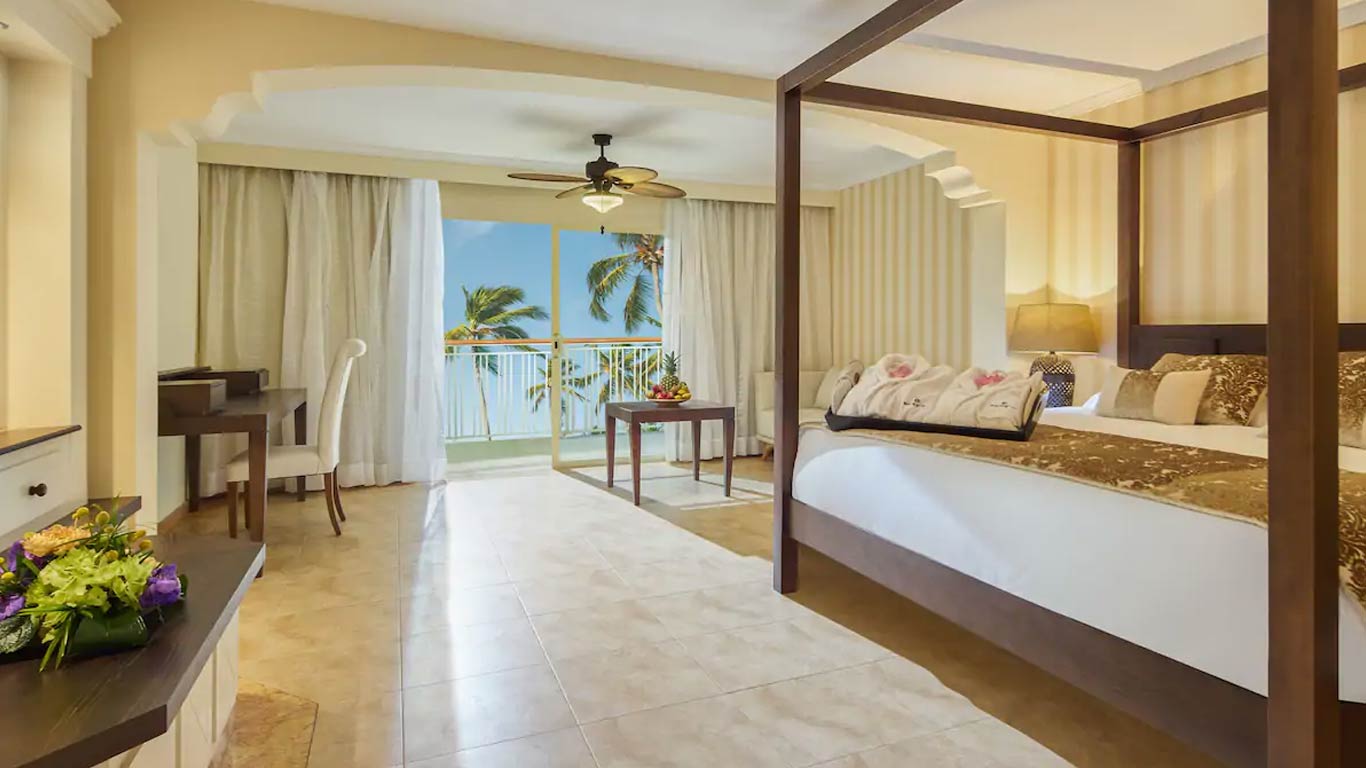 The Colonial Club Junior Suite Ocean View at Majestic Colonial Punta Cana stands at 50 square meters (532 square feet) and has a balcony with sea views from the side or front. Located on any floor of the Colonial Club, has a maximum occupancy of 2 adults and comes with a King size bed or two doubles and indoor Jetted Tub.